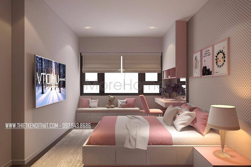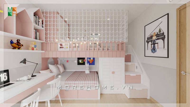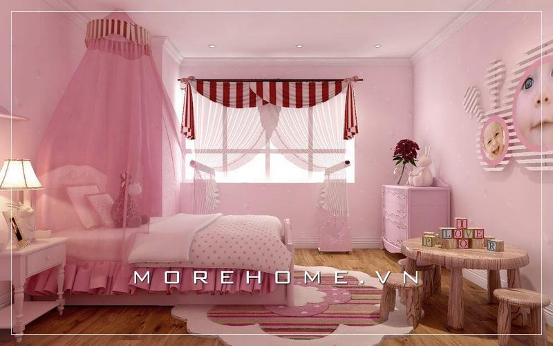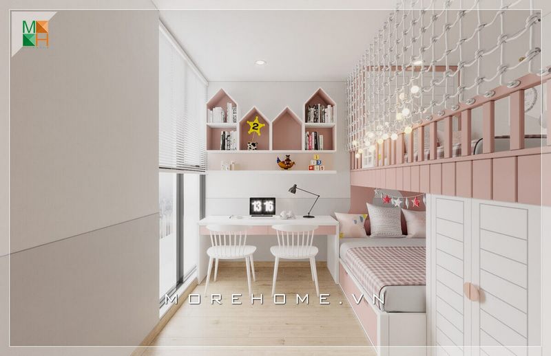 Với bé giá nhỏ tuổi KTS Morehome thiết kế một không gian phòng ngủ ngọt ngào, tông hồng – trắng chủ đạo sinh động đáng yêu