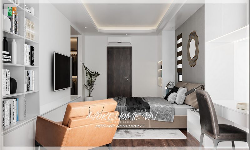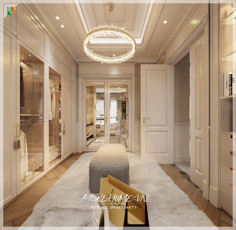 Phòng thay đồ được thiết kế với ton màu trắng chủ đạo, giúp mở rộng không gian, tạo cảm giác thoải mái, sạch đẹp và thẩm mỹ cao.