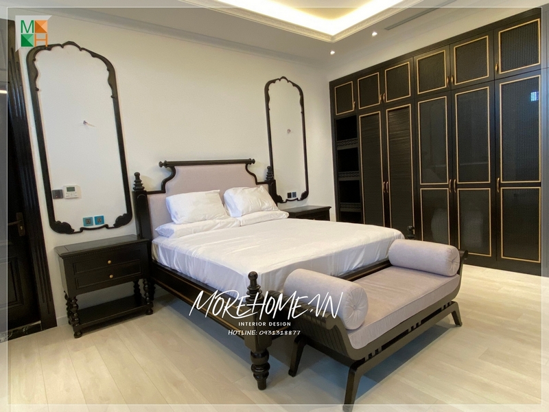 Nội thất phong ngủ không gian riêng tư mang đậm dấu ấn phong cách indchine kết hợp giữa nét Á Đông và cổ điển của pháp thể hiện sự cao cấp, sang trọng, tiện nghi, thẩm mỹ cho không gian