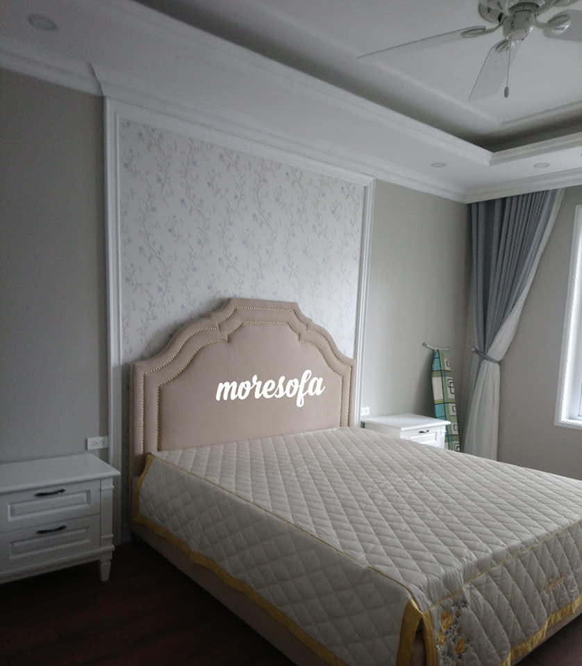 Việc sử dụng tab đầu giường gỗ tự nhiên màu trắng tân cổ điển để tô điểm trang trí cho không gian sẽ làm cho nó trở nên sang trọng hơn.